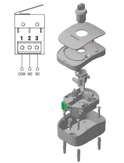 Подсоедините необходимые электрические провода к клеммному блоку микропереключателя.